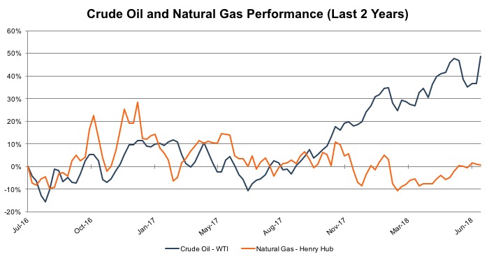 As we have discussed in previous posts, there are 21 main oil and gas-focused partnerships that are publicly traded, as of June 30, 2018. Publicly traded royalty partnerships have been slowly regaining the value lost when crude oil prices fell below $30 per barrel in early 2016. In the two years since June 2016, 16 of the 21 royalty partnerships have had positive returns with an average return of 48%. Over the past two years, the remaining five partnerships experienced a negative 31% average return. In those two years, natural gas prices have experienced an insignificant increase of just 5%, while oil prices have risen more than 50%. The underperformance of natural gas prices is due to the surge in production of shale gas since 2006 and the more recent rise of natural gas production as a result of increased oil production.