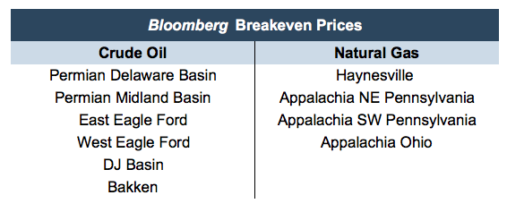 Many analysts and investors, including our oil and gas team, track Bloomberg New Energy Finance for region specific breakeven prices. Beginning in January 2014, Bloomberg began publishing monthly breakeven oil prices and breakeven natural gas prices for the following regions.