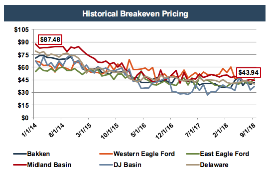 Even as oil prices have started to recover, companies are showing lower breakeven costs than ever before. As shown in the chart below, breakeven prices in the Midland Basin fell by 50% from $87 in January 2014 to $44 in September 2018.