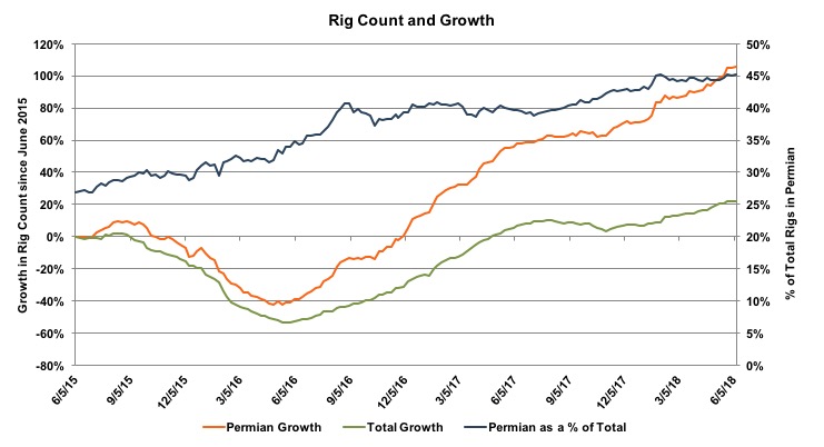 With many producers clamoring for a piece of the action, the number of rigs in the Permian has consistently grown at a faster rate than total rig counts in the country. As a result, the Permian has increased its share of total rig counts, as seen in the graph below. In June 2015, the Permian accounted for 27% of all rigs, but that number steadily increased to 45% as of June 2018. The number of rigs in the Permian has grown 32% in the past year, compared to 16% nationally; these figures were 156% and 125% for the year before that.