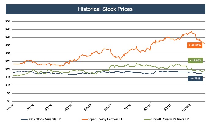 Royalty MLPs and aggregators (not to be confused with royalty trusts which do not actively aggregate minerals) have only recently entered the public investment sphere, although the oil and gas mineral market has been around since Colonel Drake begat the industry in 1859. Viper Energy Partners IPO’d in 2014, Black Stone Minerals followed in 2015 and Kimbell went public last year. Performance this year has generally been strong with Black Stone Minerals lagging. Viper Energy Partners has led the way this year in market value increase. Two factors appear to be pushing it ahead of its peers: (1) it is focused in the hot Permian Basin; and (2) about 39% of its acreage is operated by its sister company, Diamondback Energy (the “other” FANG stock).