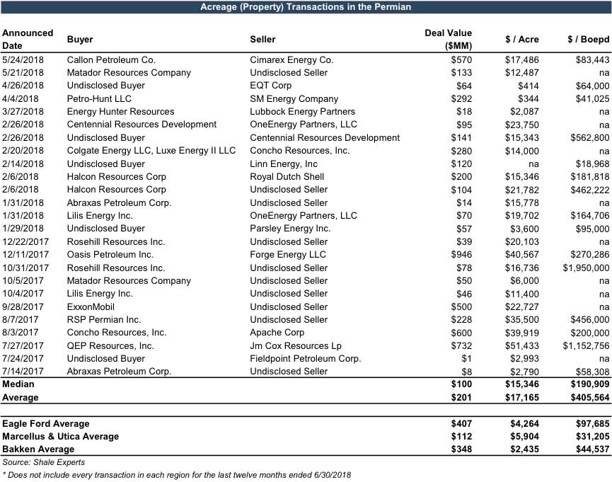 While Pioneer just exited its current position at multiples lower than what might be otherwise expected for the region, they are looking to buy acreage in a region where multiples have flown through the roof. Recent acreage transactions in the Permian Basin are closing at median multiples of $16,000 per acre and over $180,000 per flowing barrel as summarized below, according to Shale Experts.
