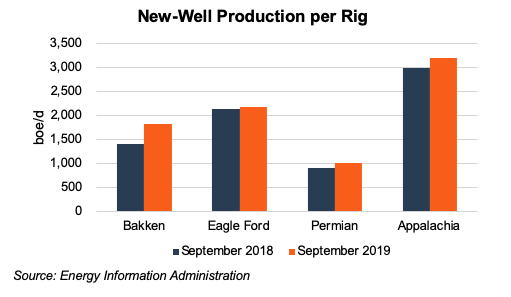 The rig count in the Bakken at the end of September was unchanged from the year prior at 53. While not impressive at first glance, the total U.S. rig count declined nearly 20% over the same period. Eagle Ford, Permian, and Appalachia rig counts declined 22%, 15%, and 17%, respectively.