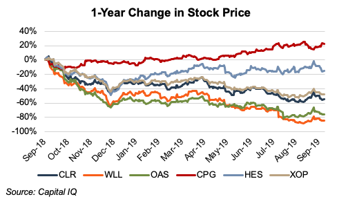 Continental, Whiting, and Oasis all unperformed the broader E&P index during the past year, with Whiting down a notable 85%. Oasis is funding its Permian development program with cash flows generated from its Bakken position, a strategy that has fallen out of favor with investors who now seek capital discipline and free cash flow generation. Whiting is down largely on concerns regarding leverage and inventory life. All three saw margin compression, with Whiting’s EBITDAX per boe down nearly 30% year-over-year.