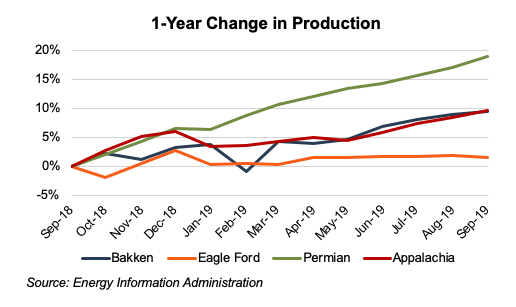 Bakken production grew approximately 10% year-over-year through September. While this growth rate lags behind the Permian, it is in line with production growth in Appalachia and meaningfully bests the Eagle Ford.