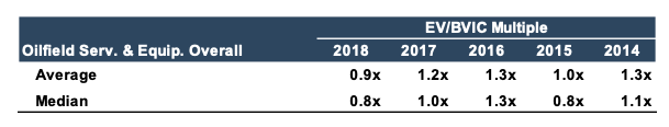 EV/BVIC multiples have fallen since the middle of the year and even below observed 2017 levels. Investors were not expecting to receive adequate return on capital deployed at these companies. After analyzing our guideline companies for oilfield services and equipment overall, observed average and median multiples for 2018 were below 1.0x for 2018.