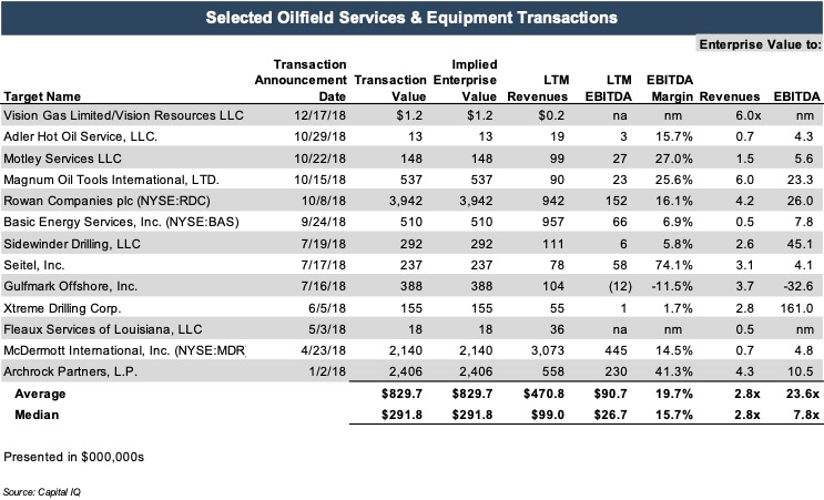 Transaction activity for the oilfield services sector for 2018 was near identical to 2017 in terms of number of deals, and total deal value saw a slight uptick. Low volatility and stable growth that defined 2017 markets and steadily increasing oil prices for most of 2018 have allowed for moderate transaction activity compared to the two years prior to 2017. This environment has also facilitated OFS companies to be more methodical in acquisitions compared to the past.