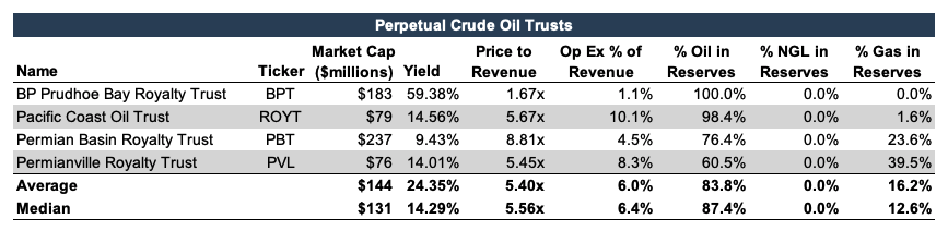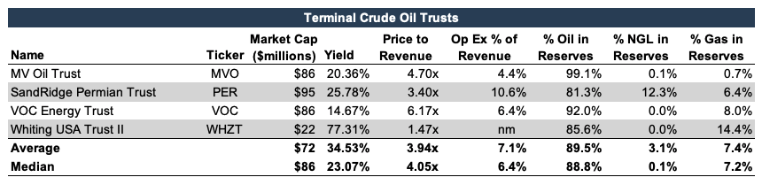 Compared to natural gas focused trusts, crude oil trusts tend to have relatively higher market caps with similar yield and pricing multiples, despite being based on a different commodity. The levels of operating expenses are comparable as well. For this post, we have further delineated between perpetual and terminal crude oil trusts. The latter have a specified end date, while the former do not. However, both groups ultimately will receive distributions related to crude oil prices and declining production, regardless, whether there is a statutory termination or not. Going forward, we do not plan to group these separately.