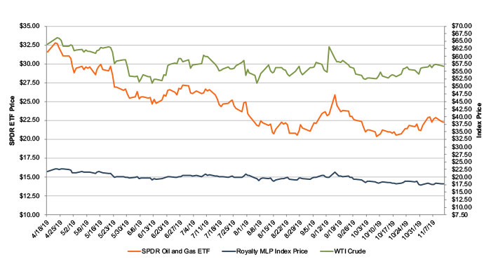 Energy commodity cycles can sometimes proffer interesting market dynamics. At various points, participants along the energy chain can benefit or suffer from the natural consequences of these changes. In the long run, commodity prices ultimately drive economics. Right now, exploration and production companies and oilfield service providers are grappling with austerity measures that investors are demanding. Most other upstream areas are struggling too; however, publicly-traded royalty and mineral aggregators are performing relatively better than their operating counterparts. While equity prices have dropped by approximately 30% for producers (according to SPDR Oil and Gas ETF), six publicly-traded royalty aggregators relatively outperformed the SPDR Index. These Royalty MLP’s (a bit of a misnomer as all are not partnerships) have tracked closer to crude oil prices, anchored by sizeable dividend payments, thus buoying sliding equity prices. If dividend yields are added back, some of them have been outperforming crude prices.