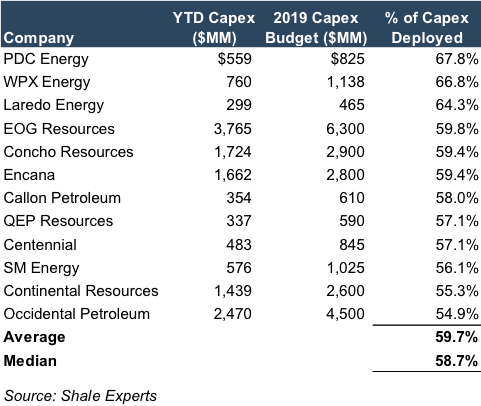 There are many factors at play in this number. Capex can and tends to be frontloaded due to seasonal factors. Still, executives will be hoping that their drilling efficiencies are achieved. Some companies may find issues hitting their production targets while decelerating drilling activities. They may be stuck between a rock and a hard place: failing to reach production targets or failing to remain within capex budgets.