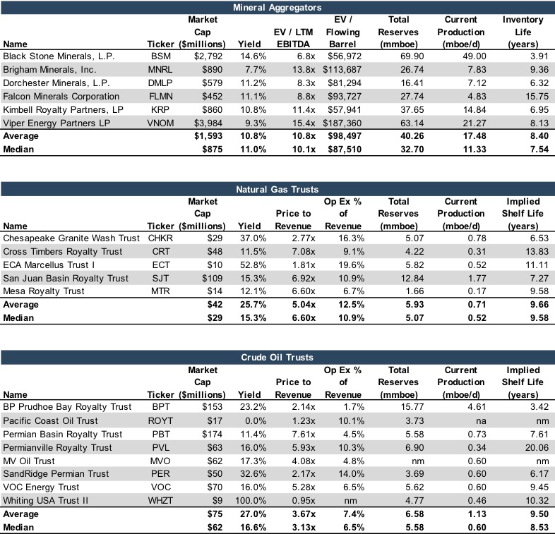 Mineral aggregators appear to have supplanted public royalty trusts as a key means for investors to get exposure to the sector while avoiding costly drilling expenses. While functionally related to drilling activity and well performance, aggregators allow investors to avoid cost burdens.  As such, valuations for the aggregators behave differently than other participants in the energy sector.