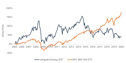 The graph below shows the relationship between the Vanguard Energy ETF, created in 2004, and the SPY Index over a 15-year period.  Slow economic growth coming out of the recession caused Energy to outperform, but commodity price declines in late 2014 began a reversal that has widened since 2017.