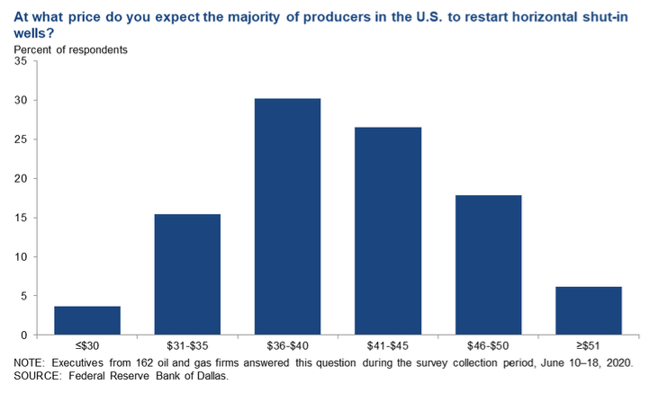 Valuation would be made easier if we could determine when oil prices would rise again. Valuations vary as to producers’ sensitivity to this price. The Dallas Fed’s latest survey suggests that $40 is about the tipping point to restart shut-in wells, but not necessarily to drill new ones: