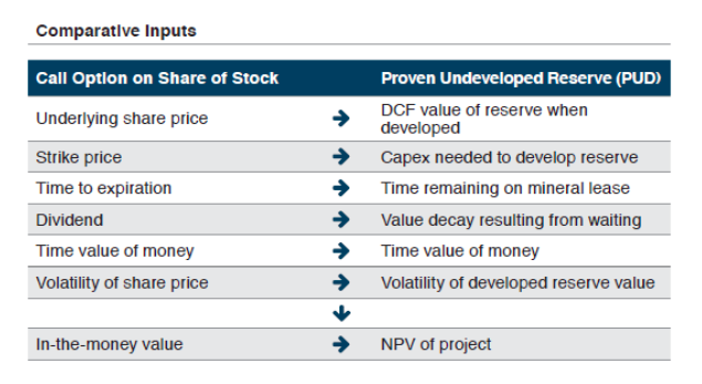 The PUD and unproved valuation model is typically seen as an adaptation of the Black Scholes option model. It is most accurate and useful when the owners of the PUDs have the opportunity, but not the requirement, to drill the PUD and unproven wells and the time periods are long, (i.e. five to 10 years). The value of the PUDs thus includes both a DCF value, if applicable, plus the optionality of the upside driven by potentially higher future commodity prices and other factors. The comparative inputs, viewed as a real option, are shown in the table below.