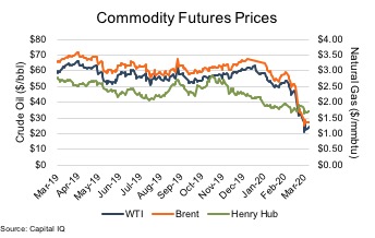Since then, prices continued to decline, with WTI front month futures settlement prices hitting $20.83 on March 18.  Prices have rebounded somewhat from this level but remain extremely volatile.