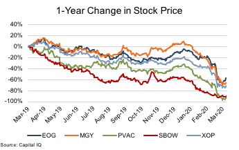 All Eagle Ford E&P operators analyzed have had year-over-year stock price declines.  EOG and Magnolia outperformed the broader E&P universe (XOP), though Penn Virginia and Silverbow are both down more than 90%.