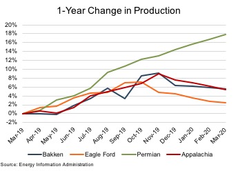Eagle Ford production grew approximately 2% year-over-year through March, lagging behind the Permian (18%), Bakken (6%) and Appalachia (5%).  This is driven, in part, by the maturity of the Eagle Ford play relative to other areas, as well as the Eagle Ford’s relatively high proportion of gas production.