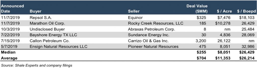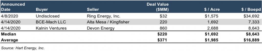 Although the merger and acquisition market is likely to reveal limited information, it doesn’t mean that there are no transactions. In fact, just this month there were a few transactions announced that give a glimpse into how valuations are being set from a production and acreage value perspective. Value per acre is another metric that ranges based on numerous factors. However, in recent years depending on those factors, many deals traded around $8,000 to $12,000 per acre. In the Permian Basin, deals often traded above $20,000 per acre. Below is a sample of transactions in 2019 in the Eagle Ford shale area that illustrate this: