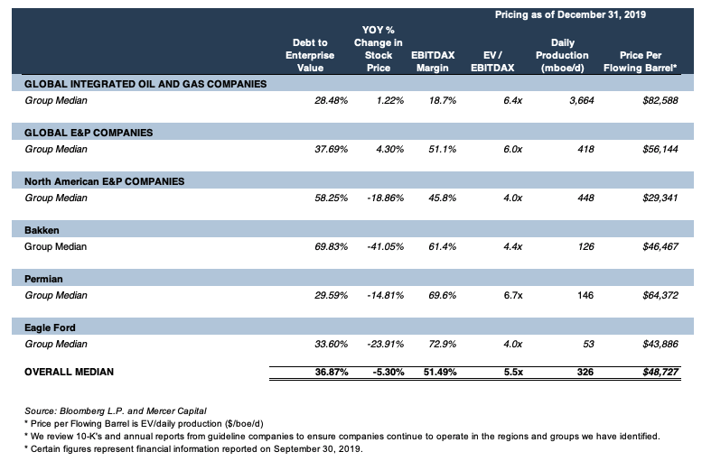 Predictably, valuations have been in a free fall. What may be unexpected is how those valuations have changed relative to prices or even other companies that are operating in different basins. Mercer Capital tracks groups of public oil and gas companies and categorizes them according to focus. There are integrated global producers, non-integrated global producers, North American focused producers, and even basin focused producers. Mercer Capital follows several valuation-related data points, but some key ones include enterprise value per flowing barrel which shows a company’s publicly traded enterprise value relative to its daily production. The table below shows the median results from those groups and from the entire sample.