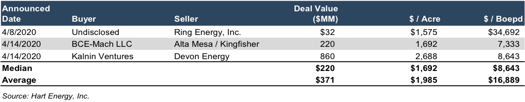 Therefore, upstream producers are de-incentivized to drill new wells, leading to the value of new inventory decreasing at an even proportionally higher rate. This dynamic has been exacerbated by the market’s focus on cash flows in priority to reserves in recent years. Investors had already been pulling valuations down as their standard tilted more towards shorter-term returns as opposed to longer-term reserves. To be sure, producers have reduced capital expenditures by historic amounts in the past 45 days or so. Extending that perspective, some might think non-producing reserves are worthless. However, they would be wrong. There is an optionality value to those future reserves, also known as acreage, that bears out in the marketplace and is evidenced by transaction prices. Valuations are based on future expectations, and many people believe that prices will not stay low permanently. Therefore, the market is willing to pay a relative premium to immediate economics to account for potential future upside. It also shows up in implied public market valuations as well.