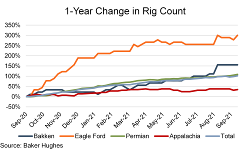As of September 17th, there were 23 rigs in the Bakken up 156% from September 11, 2020. Eagle Ford, Permian, and Appalachia rig counts were up 300%, 109%, and 34%, respectively, over the same period.
