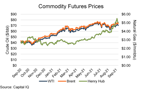 After a significant run-up in the first two quarters of the year, oil prices were largely range-bound during the third quarter of 2021, with front-month futures prices for West Texas Intermediate (WTI) generally oscillating between $65/bbl and $75/bbl. Rising COVID-19 cases in the U.S. caused the Delta variant to put a damper on travel activity and associated fuel consumption. However, producers seem to be maintaining their capital discipline even in light of higher prices, which is limiting production growth. Henry Hub natural gas front-month futures prices began the quarter at approximately $3.63/mmbtu but broke above $5.00/mmbtu in September. The current run-up in natural gas prices has some concerned about what the winter may hold, when prices generally increase due to heating demand. In Europe, declining coal capacity and less-than-expected wind generation from North Sea wind turbines have contributed to surging natural gas prices, and the situation is beginning to impact industrial production.