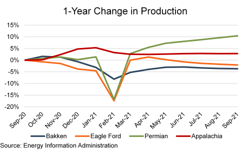 Estimated Bakken production (on a barrels of oil equivalent, or “boe” basis) decreased approximately 4% year-over-year through September. Production in the Permian and Appalachia increased 10% and 3% year-over-year, respectively, while the Eagle Ford’s production declined 2%. While production in the Bakken rebounded sharply once wells were brought back online aftercurtailments in mid-2020, it has generally trended lower during 2021. Production in the Eagle Ford and Permian was meaningfully impacted in February 2021, driven by Winter Storm Uri that disrupted power supplies throughout Texas.