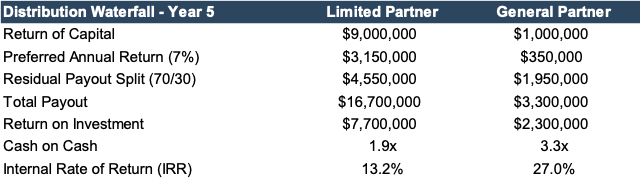 Things get interesting when contributions convert into distributions from a sale or liquidity event. Each investor can have different return profiles depending on the waterfall structure. Incentives can vary too. Sometimes they can be aligned, other times not so much. Take a hypothetical and simplified example; An upstream partnership is formed between an investor with mostly capital and a knowledgeable management team. $10 million of capital is provided to fund the assets in a domestic play with $9 million contributed by the investor and $1 million by the management team. No debt is procured. Each investor agrees that the distribution waterfall will begin with a return of each investor’s capital pro-rata, then secondly earn a 7% preferred return, lastly, residual cash flow is split 70/30. The management team runs the business and is reasonably compensated during this time. In five years, they sell the assets for $13.5 million.