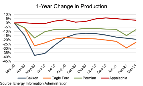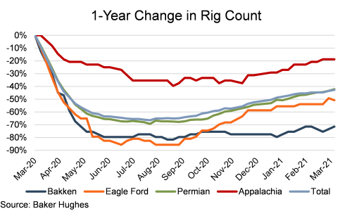 However, the Eagle Ford’s rig count has generally been rising over the past six months. Total rigs in the Eagle Ford stood at 31 as of March 26, down over 50% from the prior year, but more than 3x higher than the low of 9 rigs observed in September 2020. Bakken, Permian, and Appalachia rig counts were down 71%, 42%, and 19% year-over-year, though have all rebounded from the September lows (though not as dramatically as the Eagle Ford’s rise since then).