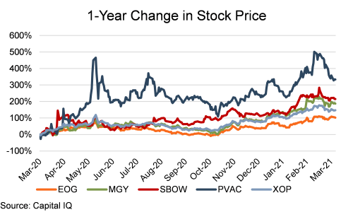 The Eagle Ford public comp group had a banner year for stock price performance over the past twelve months, with Penn Virginia, Silverbow, Mongolia, and EOG up 334%, 215%, 187%, and 102%, respectively. All except EOG outperformed the broader E&P sector, as proxied by XOP (which was up 157% during the past twelve months). However, that stock price performance is largely driven by the exceptionally low starting point in March 2020, as the Saudi/Russian price war and reduced demand due to COVID-19 lockdowns created significant concern among investors regarding the financial position of E&P companies, especially those with significant leverage. Stock prices for the four companies remain below all-time highs.