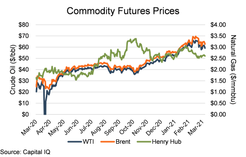 The first quarter of 2021 was relatively good for commodity prices, though they exhibited more volatility than in recent quarters. Front-month WTI futures began the quarter at ~$48/bbl and increased to a peak of $66/bbl before ending the quarter at ~$59/bbl. Henry Hub natural gas front-month futures prices broke above $3/mmbtu in February 2021, though regional spot prices were much more volatile as cold weather disrupted gas production and transmission while also increasing demand for heat and electricity.