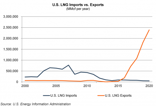 A natural question to be asked is, where is all the demand side pressure coming from? The answer, in large part, is exports. While the U.S. has exported natural gas via pipeline for many years, the capacity for LNG exports has ballooned in recent years and reached record levels in 2020 and 2021.