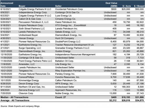 A table detailing E&P transaction activity in the Permian over the last twelve months is shown below. Relative to 2019-2020, deal count increased by five transactions, representing an increase of 23% over the 22 transactions in the prior period. Furthermore, median deal size nearly tripled from $138 million to $405 million, period-over-period. The median acreage among these transactions increased 2.5x from 14,500 acres to 36,250 acres (not shown below). Given the concurrent increase in transaction values and greater acreages acquired, the median price per net acre was down a slight 4% period-over-period.