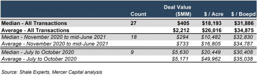 Looking a bit closer at the data, it appears there may have been an inflection point in deal valuations over the past twelve months. First and foremost, there was a notable concentration of larger-than-average deals, in terms of transaction values, from July to October 2020. Except for the Pioneer Natural Resources DoublePoint Energy transaction in early April, all deal values after October 2020 pale in comparison to those in the early period. As presented in the comparative statistical tables below, bifurcating the presented metrics further between the periods of July to October 2020 and November 2020 to the present reveals the potential pivot in valuations.