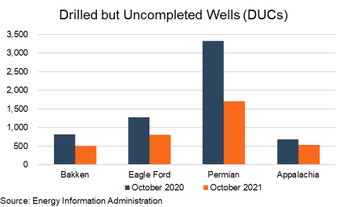 “We are encouraged by the restraint shown by U.S. upstream operators. By restricting capital expenditure, we are healing historic overproduction of both oil and natural gas. We believe investors will be attracted back into the E&P space if, as an industry, we continue on this path for at least a year or two more to deleverage balance sheets and return capital to investors.” -Fed SurveyRespondent It was a rough 2020, but producers have turned a corner on drilling discipline, and have restrained on the drill bit compared to years past. They also deleveraged balance sheets, and where possible, returned capital to shareholders. During 2021 traffic patterns have normalized, and apart from jet fuel, demand growth has bounced back to pre-pandemic levels. It is also creeping into winter and natural gas will be in season. That’s good news. Energy consumption is a bellwether for economic activity. However, that production discipline in both the U.S. and OPEC+ nations has resulted in crude oil inventories being 6% below the five-year average (2016-2020) overall. The Biden administration just announced a 50-million-barrel drawfrom the Strategic Petroleum Reserve. This imbalance started in Q3 2020 and has continued since, and is helping to keep prices high, though perhaps not for too long. The U.S. Energy Information Administration (EIA) projects this to come back into balance by Q2 2022.