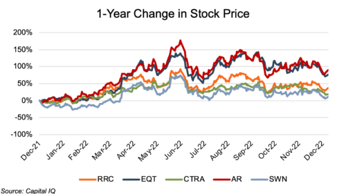 The Appalachian public comp group saw markedly strong stock price performance over the past year (through December 12th), led by Antero and EQT with price increases of 90% and 77% as of December 12th. The remaining members of the comp group showed more modest 1-year price increases of 12% to 38%. Prices peaked in early June for all members, except EQT, with year-to-date increases of 71% to 171%. EQT’s stock price peaked in mid-September at a year-to-date increase of 143%. Stock prices fell sharply beginning in mid-September but reversed direction immediately following the sabotage of the Nord Stream pipelines in the Baltic Sea that transport Russian natural gas to northern Europe.