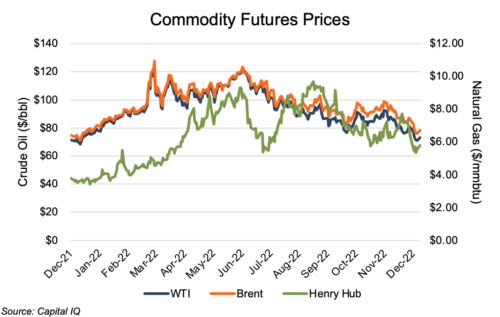 Oil prices, as benchmarked by West Texas Intermediate (WTI) and Brent Crude (Brent), also began 2022 on a steady upward trend that took the WTI from $76/bbl to $88/bbl and the Brent from $79/bbl to $91/bbl, prior to the Russian invasion. As the reality of the Russian-Ukraine war took hold, the oil benchmarks showed a marked uptick in volatility that lasted into mid-May, with prices hitting highs of $120/bbl and $128/bbl, and lows of $93/bbl and $96/bbl. Since then, WTI and Brent prices have trended downward, exhibiting more typical volatility other than modest rallies in August and October. As of mid-December, WTI sat at $73/bbl and Brent at $78/bbl.