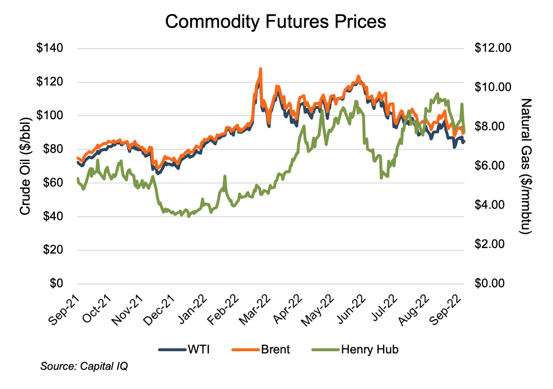 Oil prices, as benchmarked by West Texas Intermediate (WTI) and the Brent Crude (Brent), rose from $72/bbl and $75/bbl, respectively, in September 2021 to $85/bbl and $90/bbl, respectively, as of September 16, 2022. While the rise in pricing was fairly steady through mid-February 2022, the Russian invasion of Ukraine spurred a series of ups and downs, with prices spiking to a high of $120/bbl (WTI) and $128/bbl (Brent) in early March, immediately followed by a plunge to $94/bbl and $96/bbl in mid-March. Subsequent spikes and dips were somewhat more muted, but prices remained volatile through early June. A general price decline during the third quarter resulted in prices at the $85/bbl and $90/bbl level.