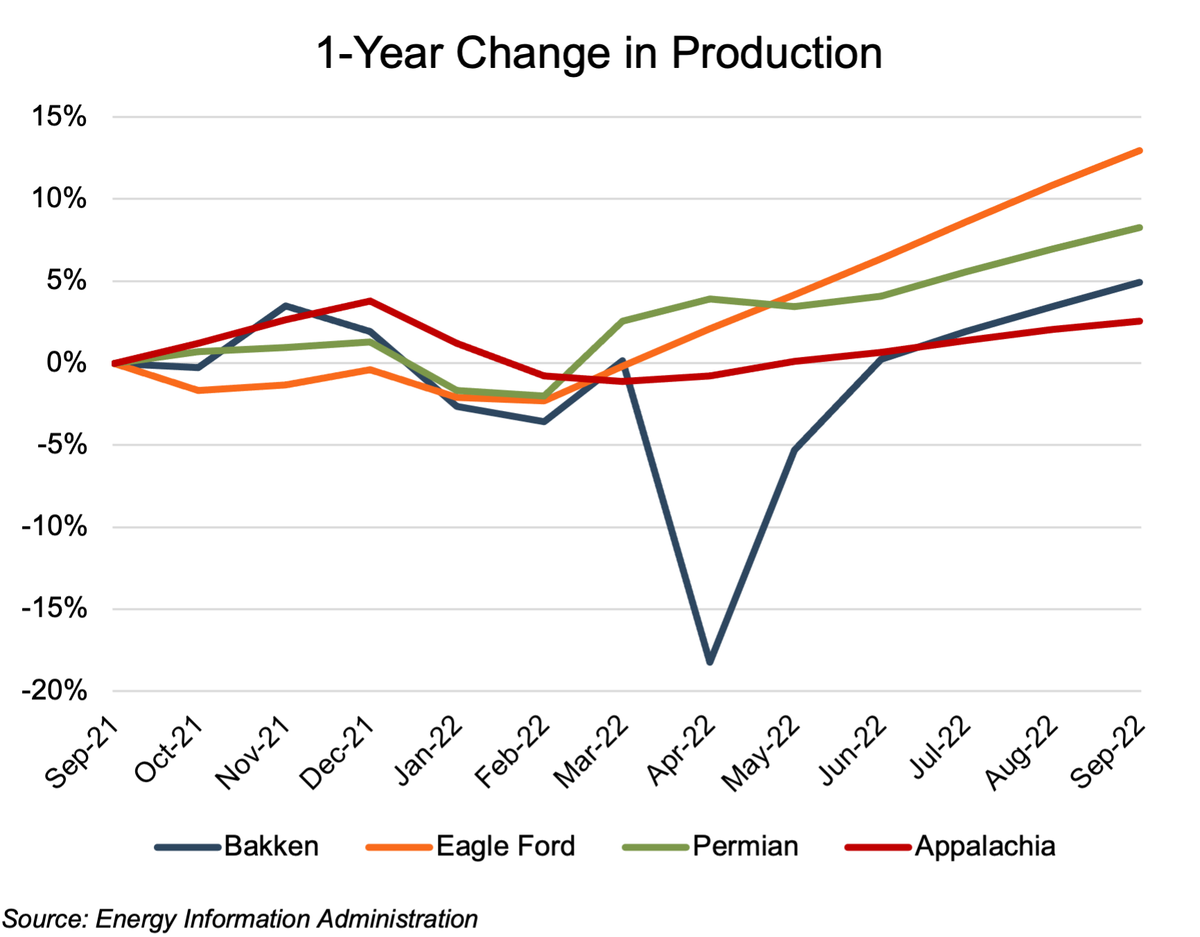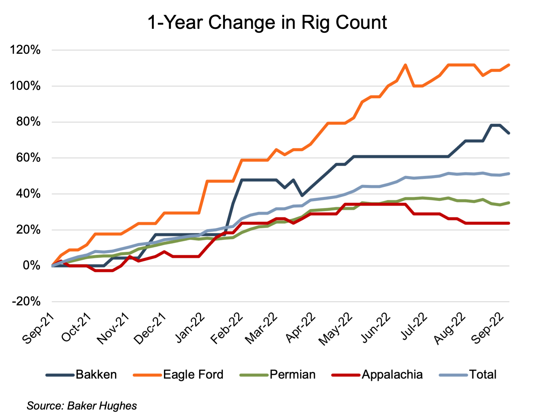 Estimated Bakken production (on a barrels of oil equivalent, or “boe” basis) increased by 5% year-over-year in September. Bakken production, relative to the September 2021 level, plunged nearly 20% in April due to the impact of back-to-back blizzards but had recovered to the September 2021 level by June 2022. Production in the Eagle Ford and Permian were 13% and 8% higher, respectively than in September 2021, without the short-lived plunge seen in the Bakken. The gas-focused Appalachia region production relative to September 2021 levels was more stable than the oil-focused regions, with relative production only varying within a band of -1% to 4%, ending at a year-over-year 3% increase in September 2022.