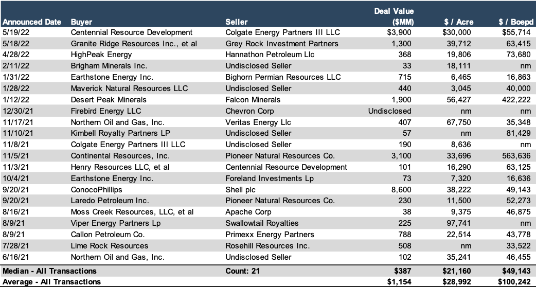 A table detailing E&P transaction activity in the Permian over the last twelve months is shown below. Relative to 2020-2021, the median deal size nearly was $387 million, just 4% lower than the median deal size of $405 million in the prior 12-month period. However, the median acreage purchased over the past year was 21,000 net acres, just over 42% lower than the 36,250 acres among the deals in the previous year. Given the concurrent decrease in acquired acreage and relatively unchanged median transaction price, the median price per net acre was up 16% period-over-period. Looking at acquired production, the median production among transactions over the past year was 5,500 barrel-oil-equivalent per day ("Boepd"), a 39% decrease from the 8,950 Boepd metric from the prior year.