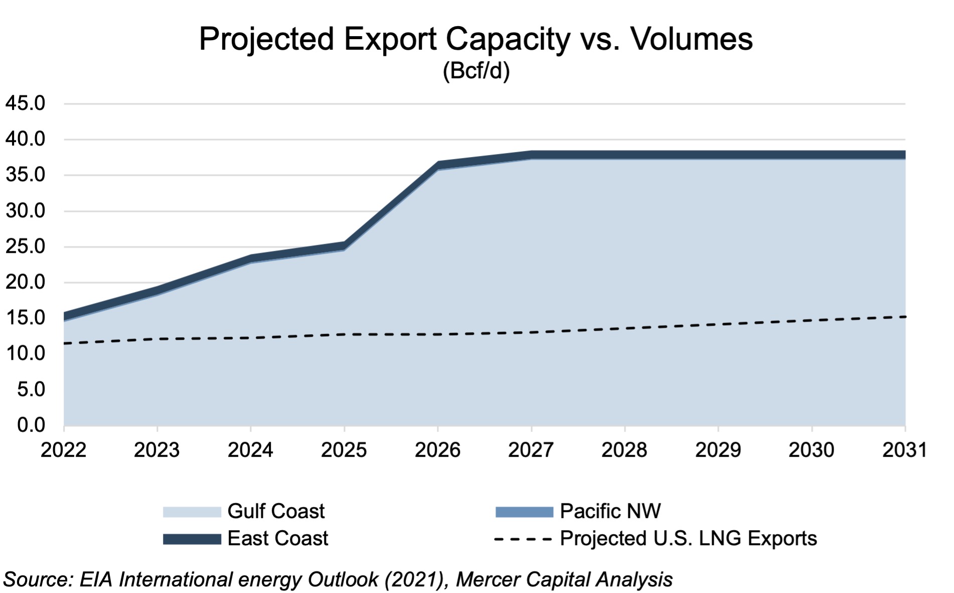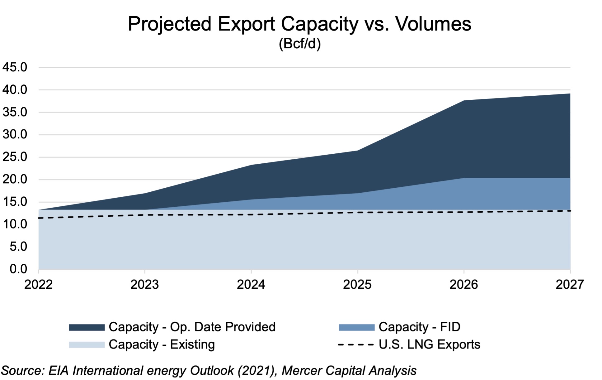 When stratifying the export capacities of all facilities for which an in-operation date has been put forth, all facilities for which an affirmative FID has been made, and all facilities which are currently in operation, it becomes clear that the capacity of the last group represents the boundary by which the projected LNG export levels anticipated by the EIA over the next 5 years are limited.