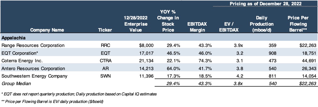 Appalachian production held steady in 2022 despite historically high commodity price volatility driven by the Russian-Ukraine war, the sabotage of the Nord Stream pipelines, and rising LNG exports to Europe to stave-off potential winter heating shortages. On an interesting note, valuations for the publics are remarkably tight. Price-to-earnings ratios are between 5.0 – 5.5x, with the exception of EQT. Other metrics have risen and are healthier than they were, but P/E ratios are the tightest. Earnings are king right now.