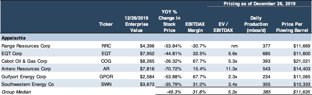 A lot has changed in the past three years that has strengthened and stabilized stock prices, margins, earnings multiples, and production multiples alike. The Appalachian public comp group saw markedly strong stock price performance over the past year (through December 28th), led by Antero and EQT.