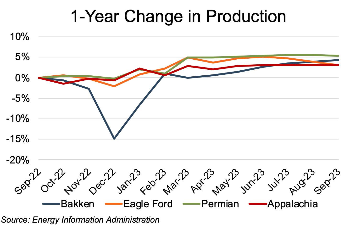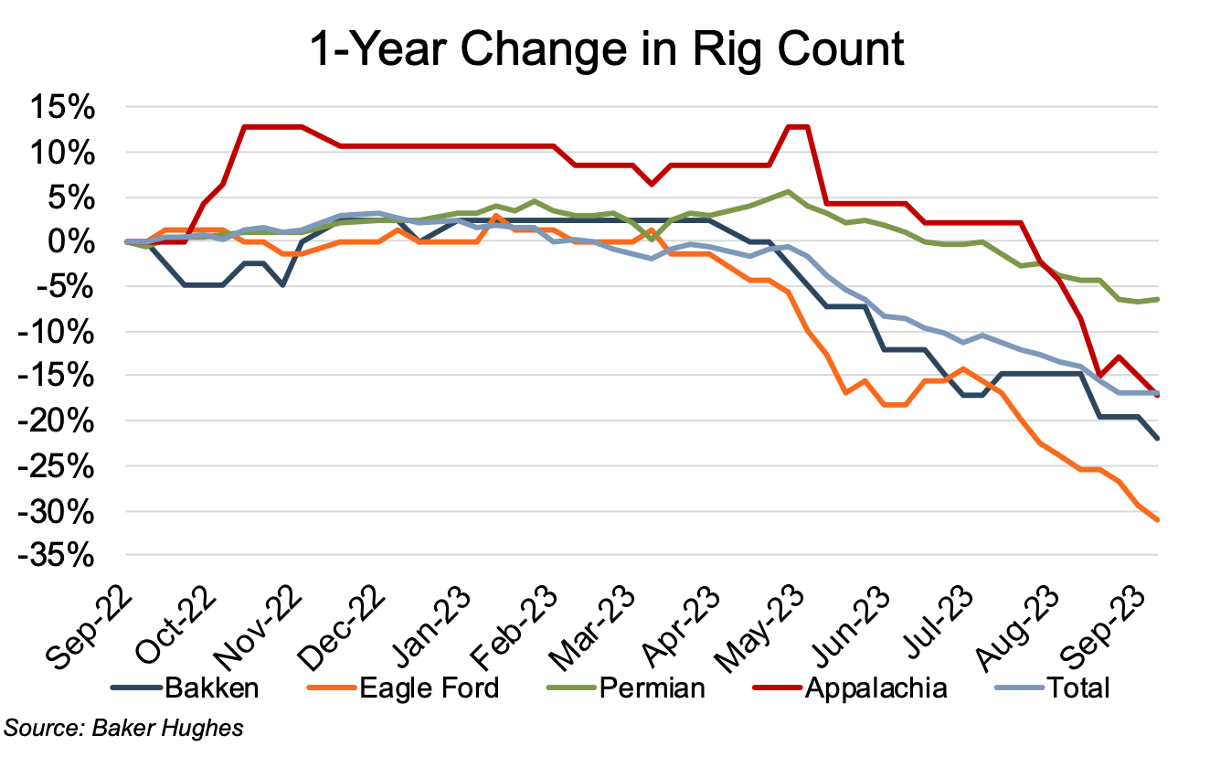 Estimated Appalachian production (on a barrels of oil equivalent, or “boe” basis) rose 3% year-over-year through August. The basin’s largest volume increases for the twelve-month review period occurred in December 2022 and February 2023, with monthly increases of 2% and 4%, respectively. Year-over-year production in the Eagle Ford, Permian, and Bakken increased 3%, 5%, and 4%, respectively, with little differentiation beyond the Bakken’s typical winter weather-induced interruption.