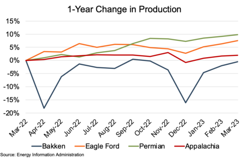 Eagle Ford production (on a barrels of oil equivalent, or “boe” basis) increased 7% year-over-year through March. Production was consistently above March 2022 levels, despite a 3% decline from August to December. The Eagle Ford production climb was second only to that of the Permian, which rose 10% over the year. Appalachian production showed a modest increase through November before a 4% decline in December. By March, Appalachian production had climbed back to a year-over-year increase of 2%. Bakken production was slightly down year-over-year, though significant winter storm interruptions in April and December caused 18% and 16% monthly declines, respectively.