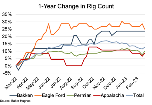 Permian and Appalachia rig count growth over the year was more muted, with 9% and 8% increases, respectively, over the year. The Permian count was the more stable of the two, holding steady between 7% and 12% over March 2022 levels since June.
