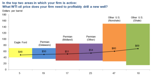 Survey results show that the average breakeven WTI price on existing Eagle Ford wells was $23/bbl, well below the average breakeven in the Permian at $28-$29 and other parts of the US at $30+. Although the economic advantage diminishes somewhat with respect to new wells, the Eagle Ford also had the lowest average breakeven price for new well development, with producers needing WTI at $48/bbl to drill profitably. That Eagle Ford level bested the Permian figure at $50-51 and other parts of the country at $54-$69.