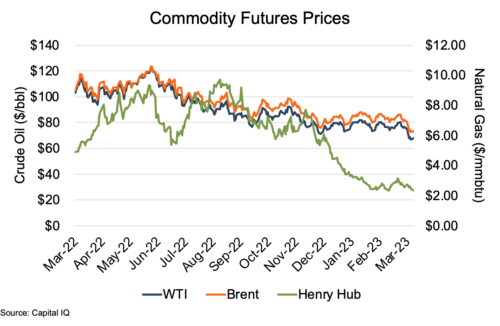 As represented by the WTI and Brent indices, oil prices generally declined over the year ending March 2023, with only two short-lived periods of increases in late May/early June and late October/early November. Other than those brief periods, the WTI declined from $115 in late March 2022 to $67 in mid-March 2023 for a 42% year-over-year reduction. The Brent followed the same pattern with an overall decline from $118 to $74 for a slightly lower 38% year-over-year decline.