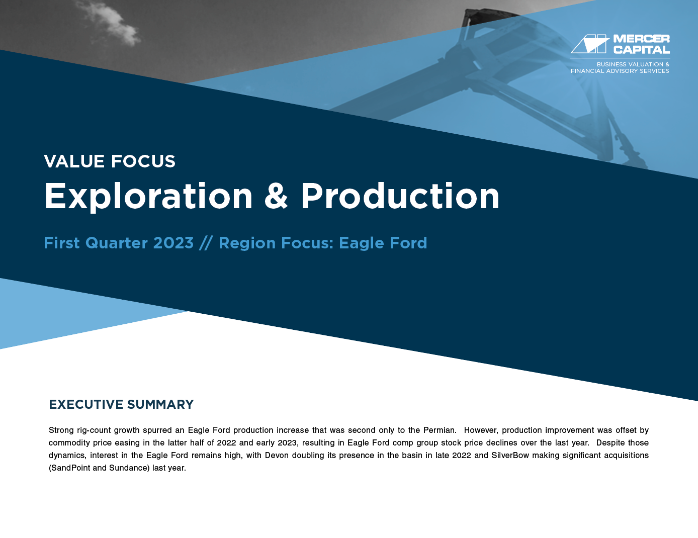 Mercer Capital’s Value Focus: Exploration & Production newsletter provides an overview of the industry through supply and demand analysis, commodity pricing, and public market performance. In addition, each issue of this quarterly newsletter focuses on a region, including Eagle Ford, Permian, Bakken, and Appalachia, examining general economic and industry trends. In this quarter’s newsletter, we focus on the Eagle Ford. Strong rig-count growth spurred an Eagle Ford production increase that was second only to the Permian.However, production improvement was offset by commodity price easing in the latter half of 2022 and early 2023, resulting in Eagle Ford comp group stock price declines over the last year.Despite those dynamics, interest in the Eagle Ford remains high, with Devon doubling its presence in the basin in late 2022 and SilverBow making significant acquisitions (SandPoint and Sundance) last year.