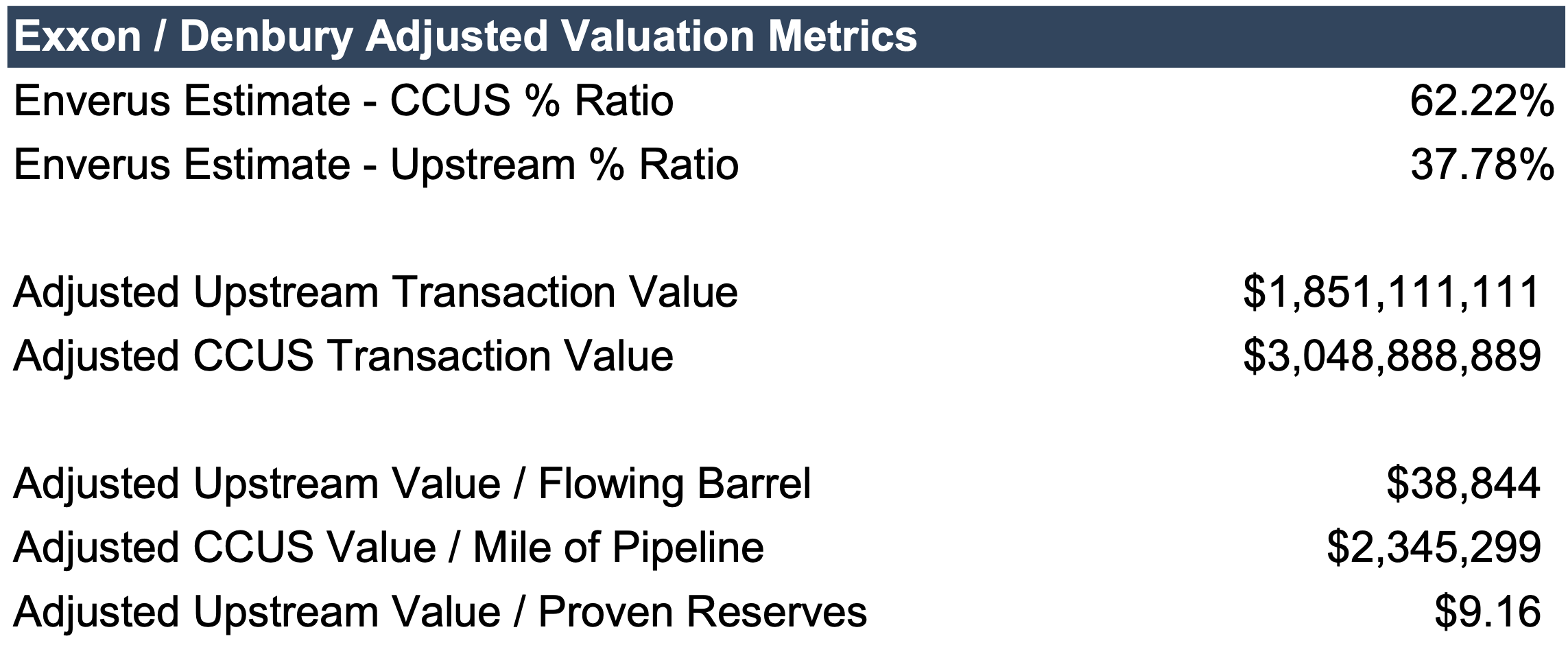 Denbury is primarily a regional oil producer with less than 50 thousand barrels per day of production and EBITDA margins lower than many public oil companies. To its credit, Denbury does have lower decline rates than other companies due to the maturity of the fields they produce from. However, the flip side is that it costs $35-$39 per barrel to produce. Those are expensive lease operating costs when many companies operate somewhere in the teens per barrel. All that said, Enverus’s estimate in their Hart Energy interview was that the EOR business contributed about 38% of Denbury’s value. So, if Enverus’s analysis is to be applied here, that would put an adjusted value on Denbury’s production at around $39,000 per barrel and an adjusted value per pipeline mile of around $2.3 million. Take a look at these “adjusted” figures: